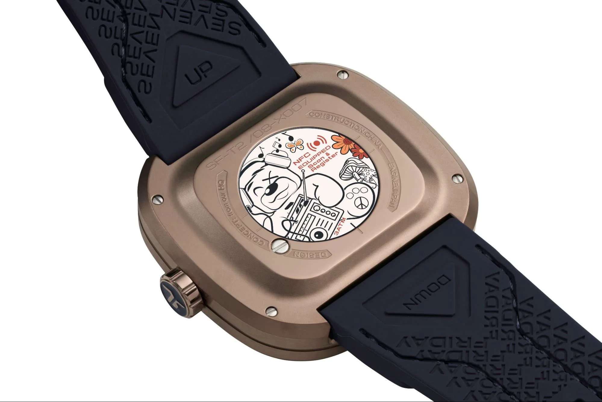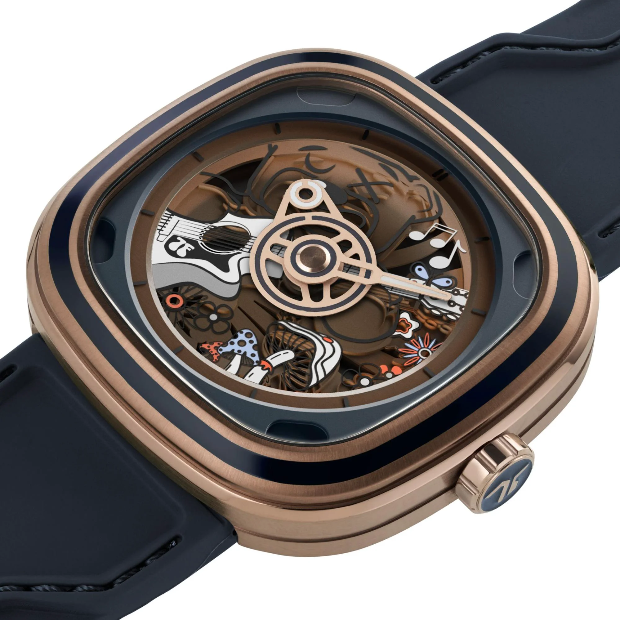 Phiên bản T2/08 sở hữu phần vỏ bằng thép không gỉ phủ lớp PVD màu nâu vàng sang trọng, kết hợp vành bezel với các đường rãnh được phủ sơn xanh Berlac tạo điểm nhấn tinh tế. Mặt số bốn lớp với ống kính bán trong suốt dạng sun lens khắc họa Riley vui tươi chơi đàn guitar, được bao quanh bởi hoa lá, bản nhạc và nấm đầy màu sắc, mang đến hiệu ứng sinh động và tràn đầy năng lượng tích cực.